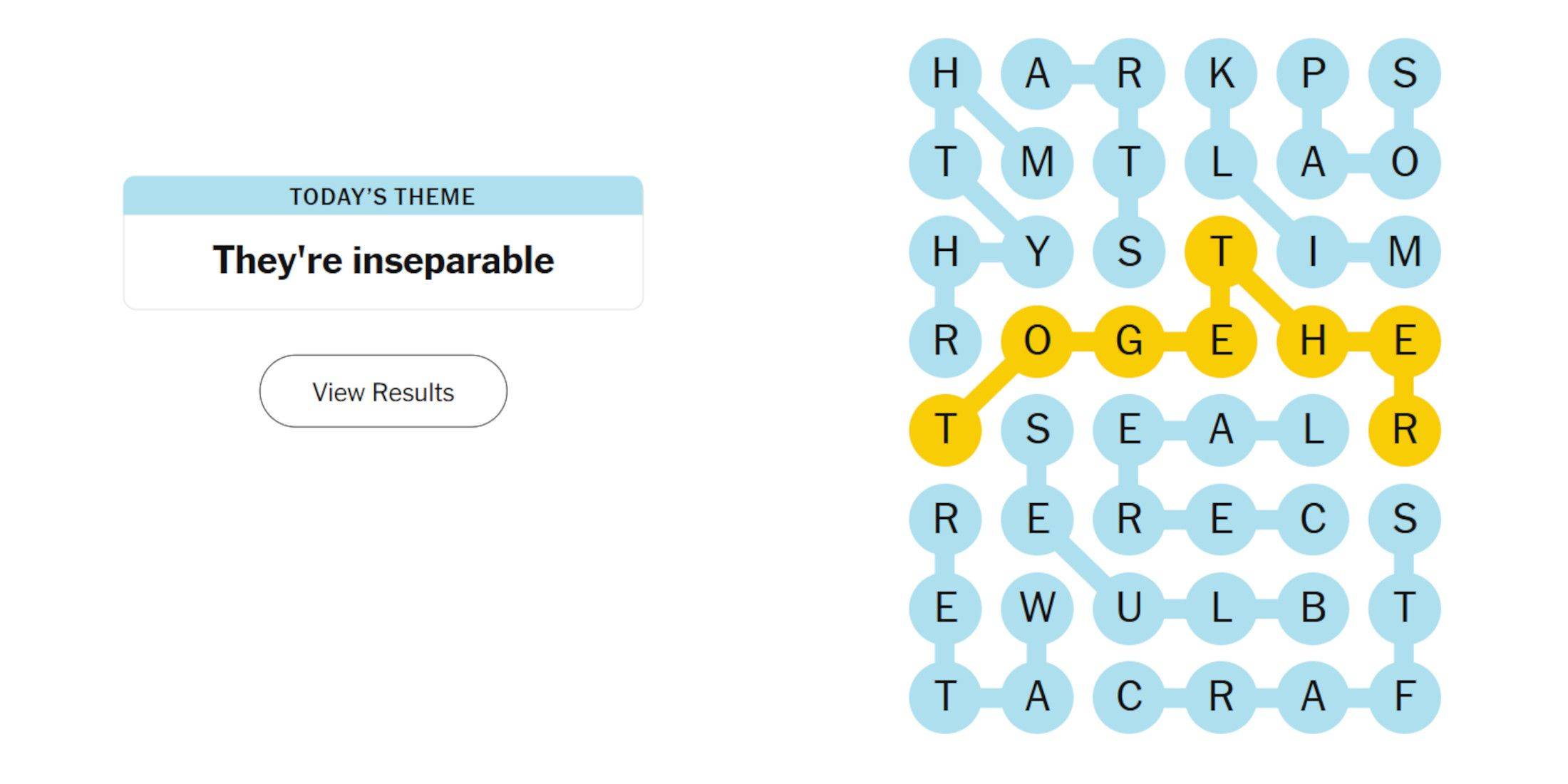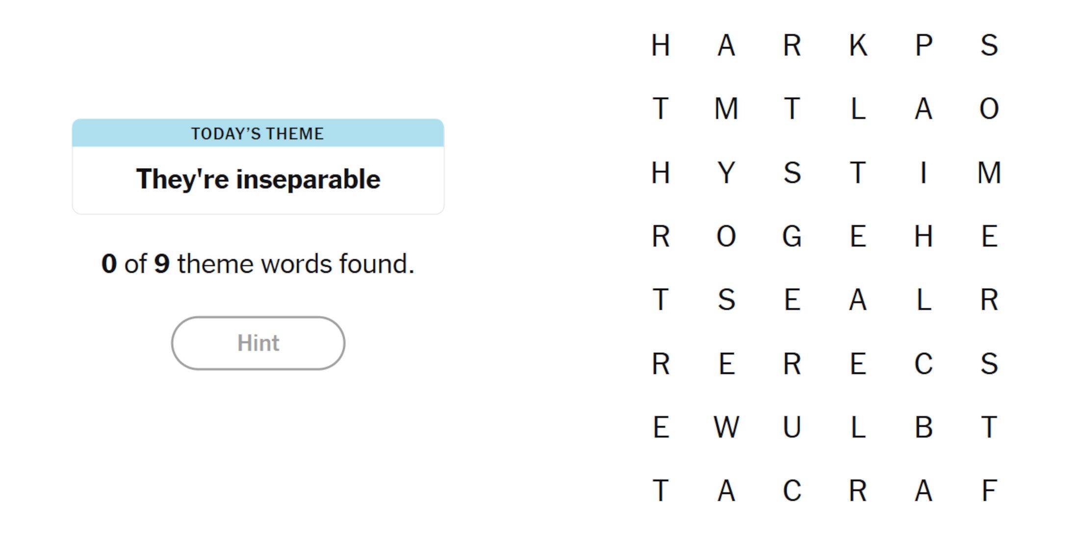 Heutzutage das Puzzle -Rätsel zeigt den Hinweis "Sie sind untrennbar". Ziel ist es, neun Elemente zu finden: ein Pangram und acht thematisch verknüpfte Wörter.