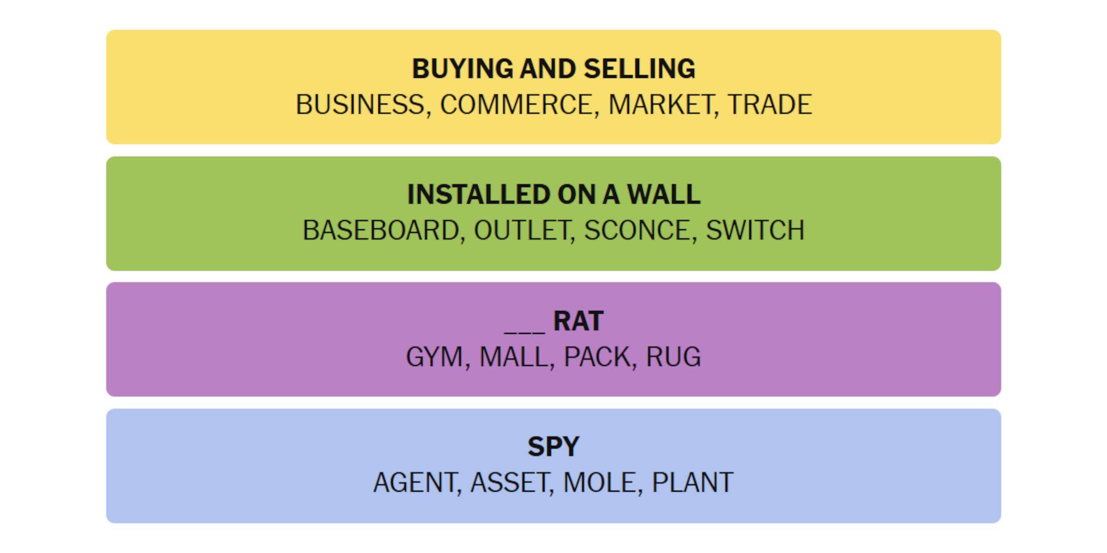 Sugerencia: cada palabra puede ser seguida por un animal de tres letras para formar una frase común.