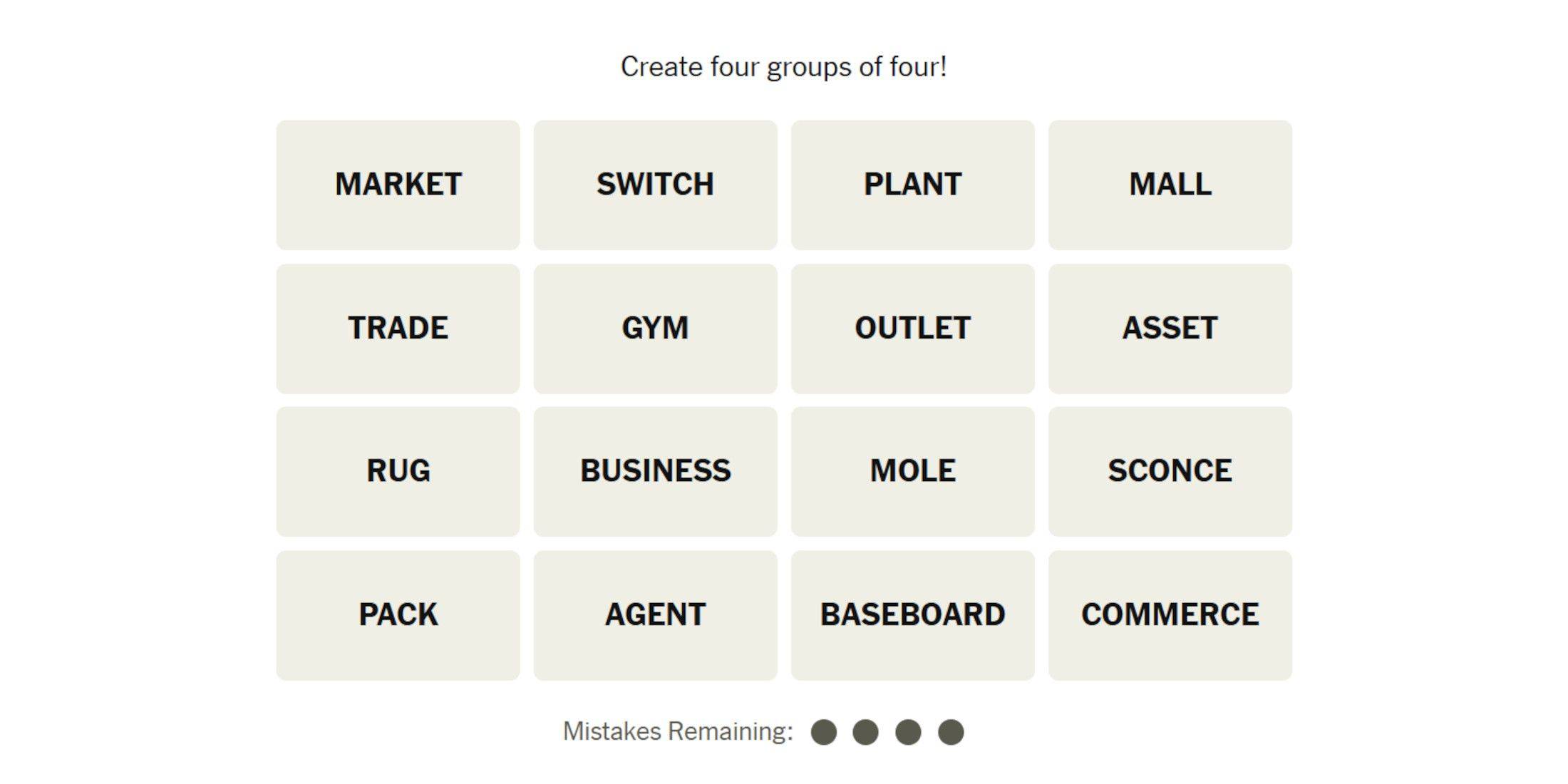 ¡Las conexiones regresan con otro rompecabezas de flexión del cerebro! Para ganar, debe clasificar correctamente dieciséis palabras con menos de cuatro errores. Las palabras en sí mismas son tus únicas pistas.