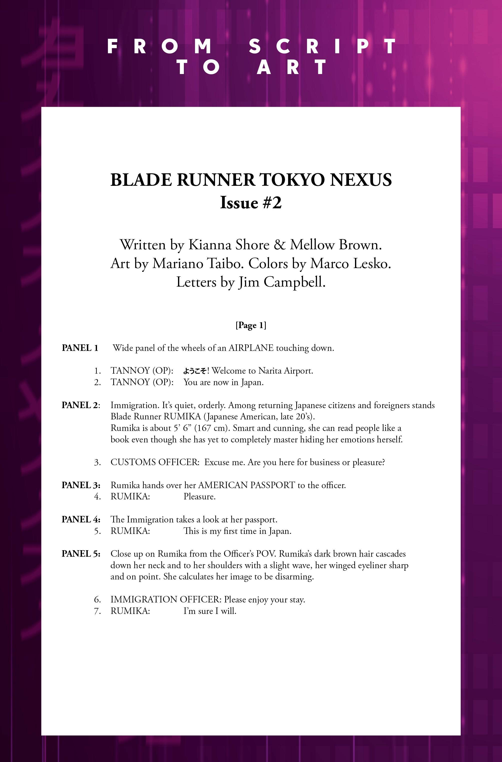 "Tokyo Nexus est un cadre autonome dans le cadre, le temps et l'histoire", explique Shore. "Bien sûr, ce ne serait pas Blade Runner sans la Tyrell Corporation apparemment omniprésente qui influence les actions des personnages ou un mystère à résoudre. Il y a des hochements de tête et des œufs de Pâques qui font allusion aux films Blade Runner, mais quelqu'un sans connaissance BR peut également profiter des bandes dessinées."