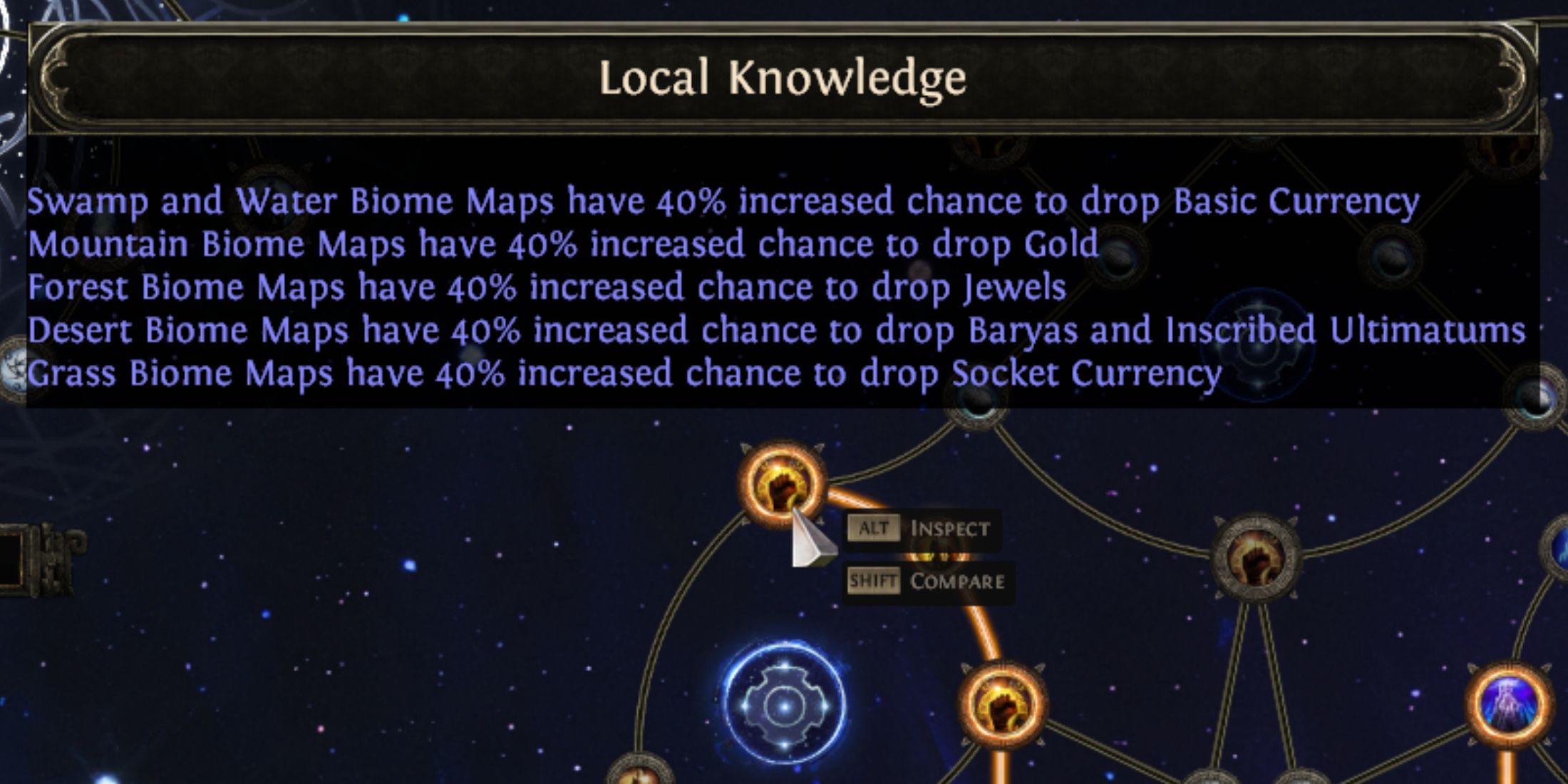 Comprendre les connaissances locales: Ce nœud Atlas n'augmente pas directement les taux de baisse mais redéfinit la piscine de butin, augmentant les baisses de la monnaie des douilles dans les biomes d'herbe. N'oubliez pas que les connaissances locales affectent également d'autres gouttes de biome (potentiellement négativement), donc allouer stratégiquement ce nœud en fonction de votre emplacement de cartographie.