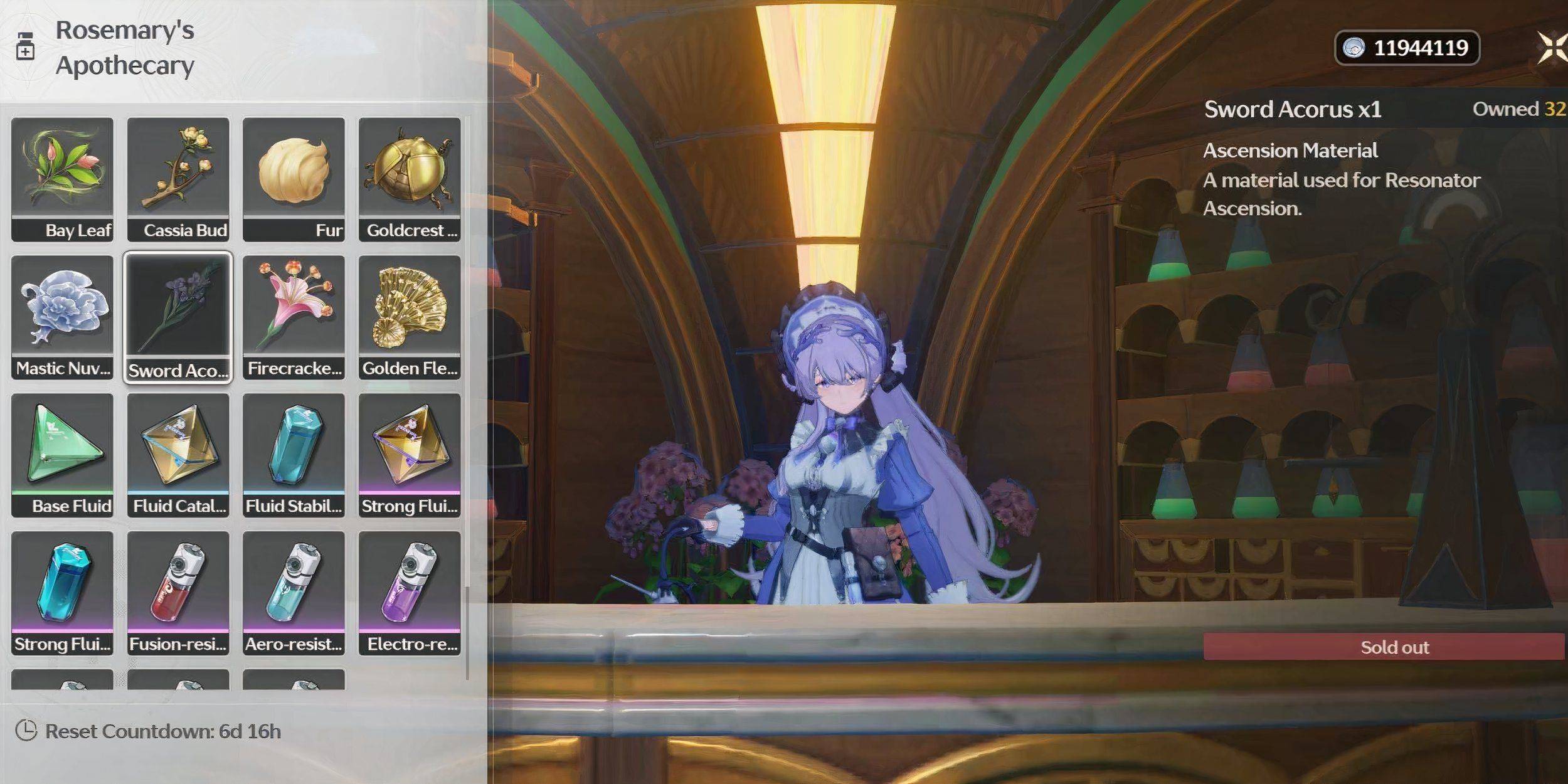 L'apothicaire de Rosemary (près de la balise de résonance) offre une offre hebdomadaire allant jusqu'à 15 Sword Acorus, à 3000 crédits chacun.