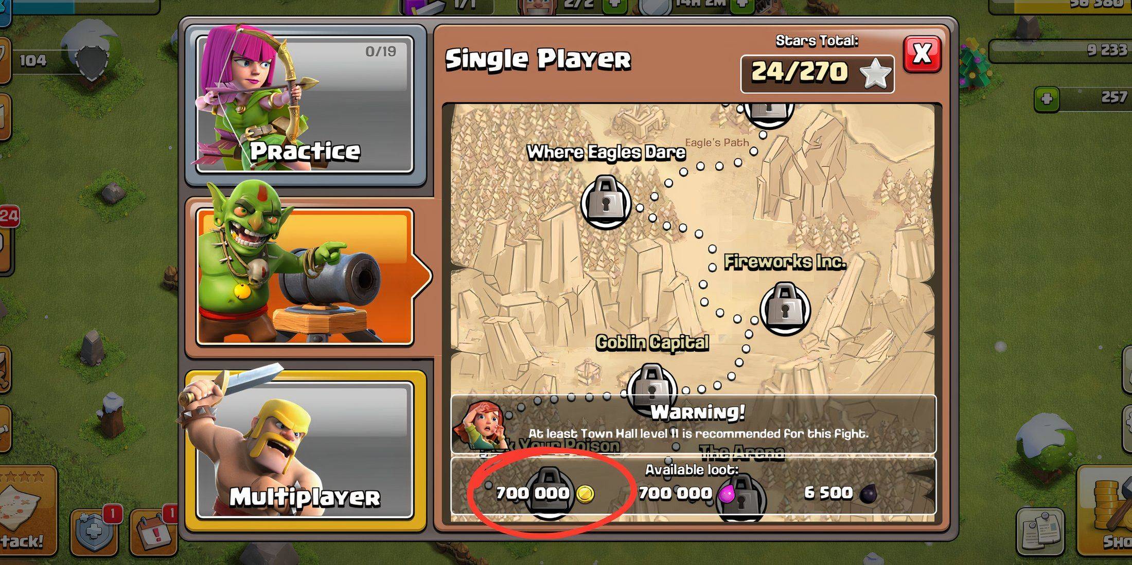 싱글 플레이어 전투에서 고블린 마을을 습격하면 지속적으로 골드를 얻을 수 있습니다. 레벨을 진행하면서 점점 더 수익성이 높은 목표를 잠금 해제할 수 있습니다. 약탈한 금은 다시 생성되지 않으므로 새로운 지역에 집중하세요.