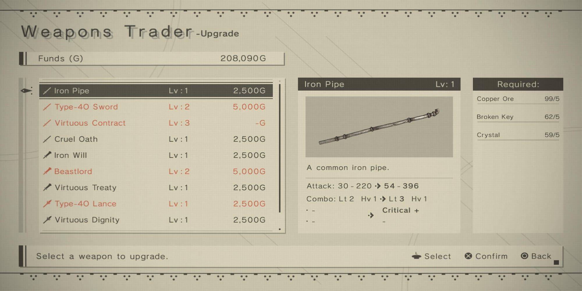 The Iron Pipe's damage range remains wide regardless of upgrade level. However, successful hits can yield some of the game's highest damage outputs, and it's obtainable early in the game. Upgrade requirements and resulting stats are: