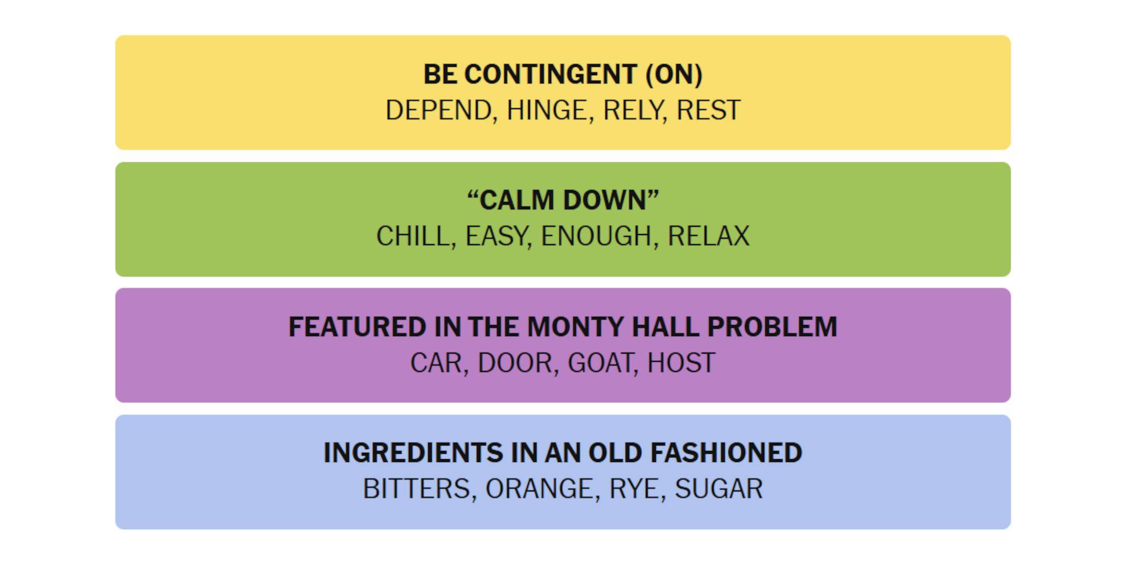 Word List: Sugar, Goat, Relax, Orange, Host, Rest, Door, Hinge, Easy, Rye, Depend, Car, Rely, Chill, Enough, Bitters