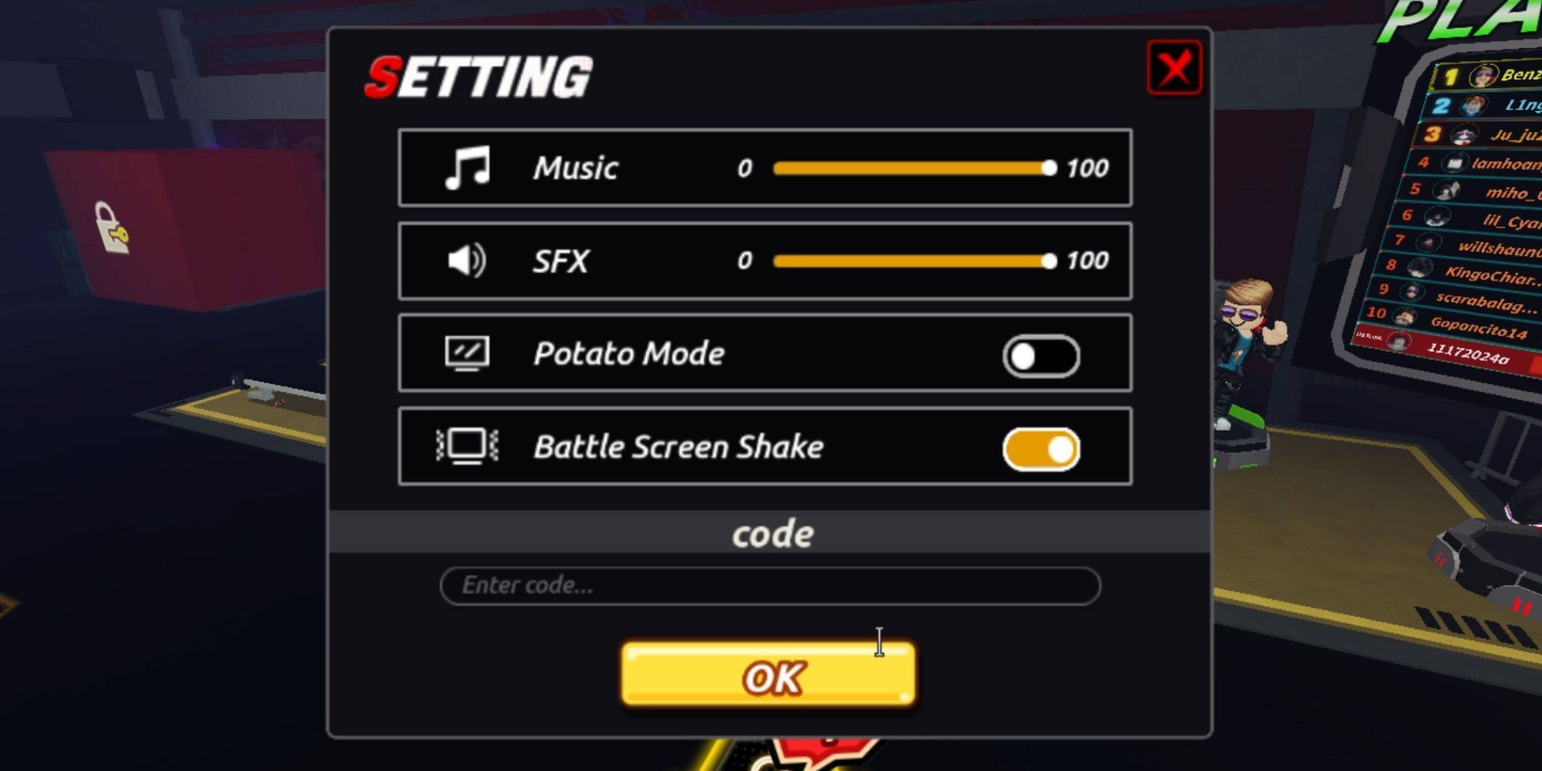 - Click the settings button to open the menu. You'll find a code entry field at the bottom.