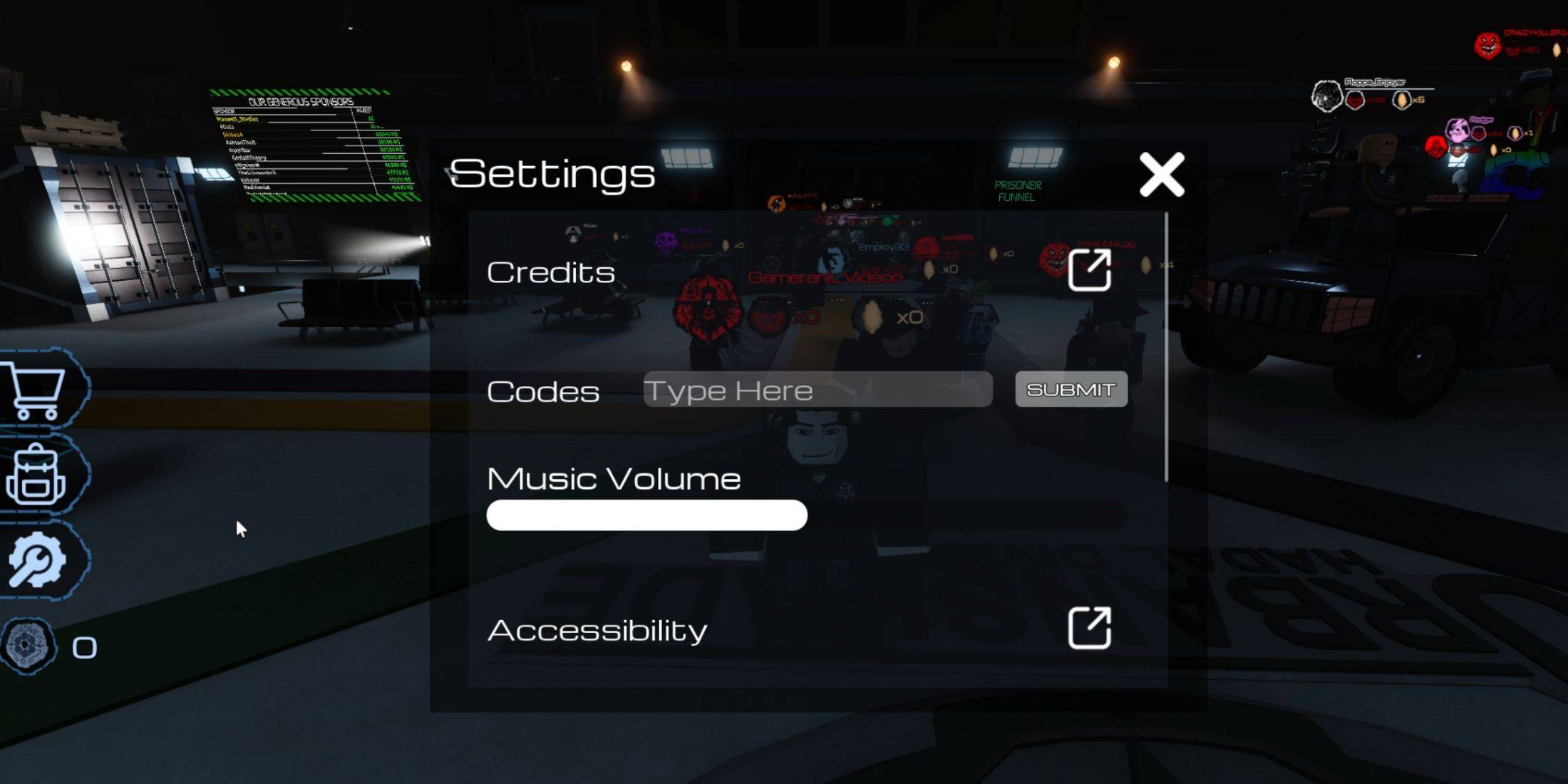 - This opens the settings menu. Find the "Codes" option, featuring an input field and a "Submit" button.