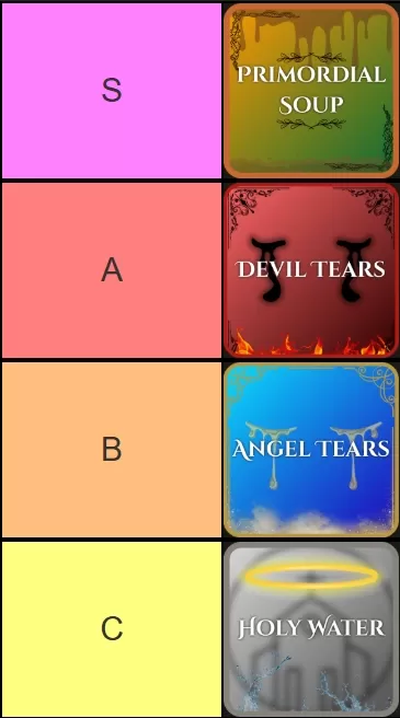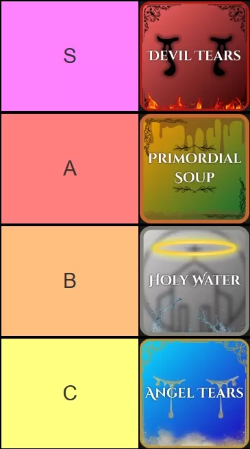 Lágrimas de Anjo oferecem cura básica, enquanto a Água Benta serve como uma Lágrimas do Diabo mais fraca. Sopa Primordial se destaca contra hordas de zumbis em qualquer cenário. Lágrimas do Diabo fornecem um controle de multidão excepcional com requisitos de fabricação fáceis.
