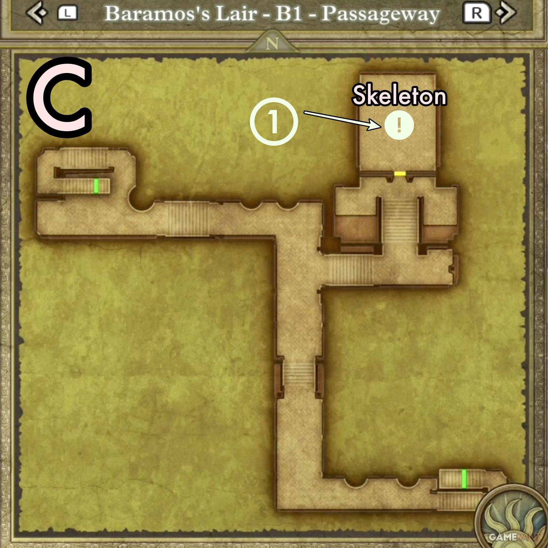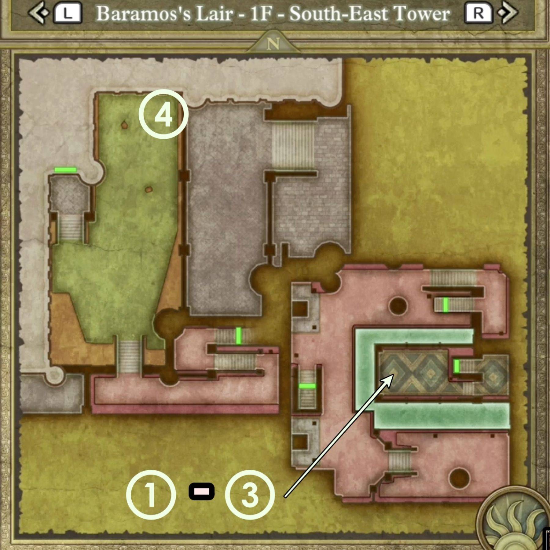 Логово Барамоса отклоняется от типичных конструкций подземелья. Вместо линейной прогрессии вы пройдете в помещении и на открытом воздухе, чтобы добраться до барамоса. Основной внешний центр, «Логово Барамоса - окружение», служит центральной точкой между конструкциями. Ниже приведен оптимальный путь к бою с боссом, с местами сокровищ, подробно описанными отдельно.