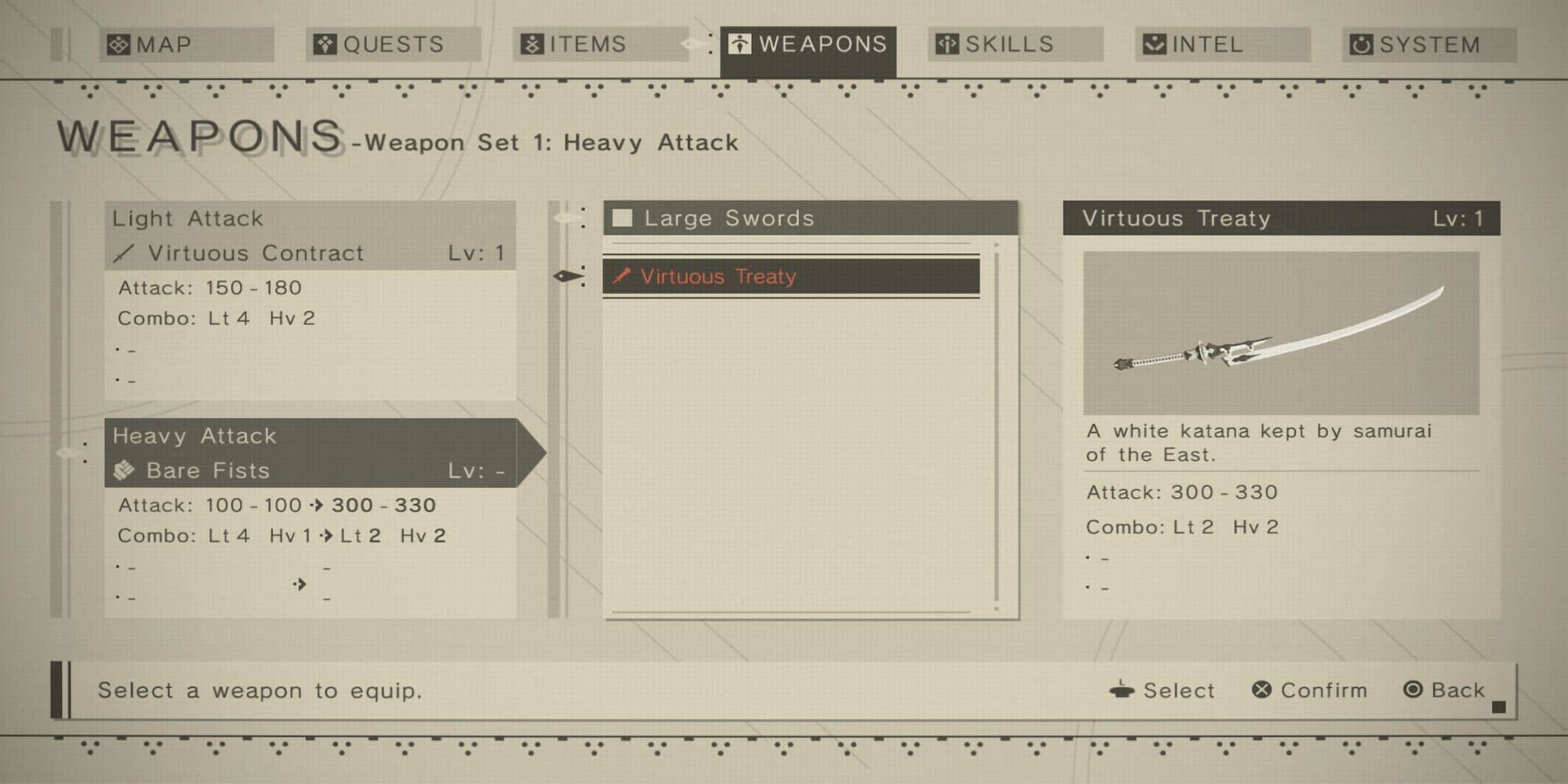Оружие с двумя руками, добродетельное договор, является мощным мечом в ранней игре, временно потерянным после пролога. Тем не менее, он быстро восстанавливается после того, как в последующей главе разблокируется свободный рог.