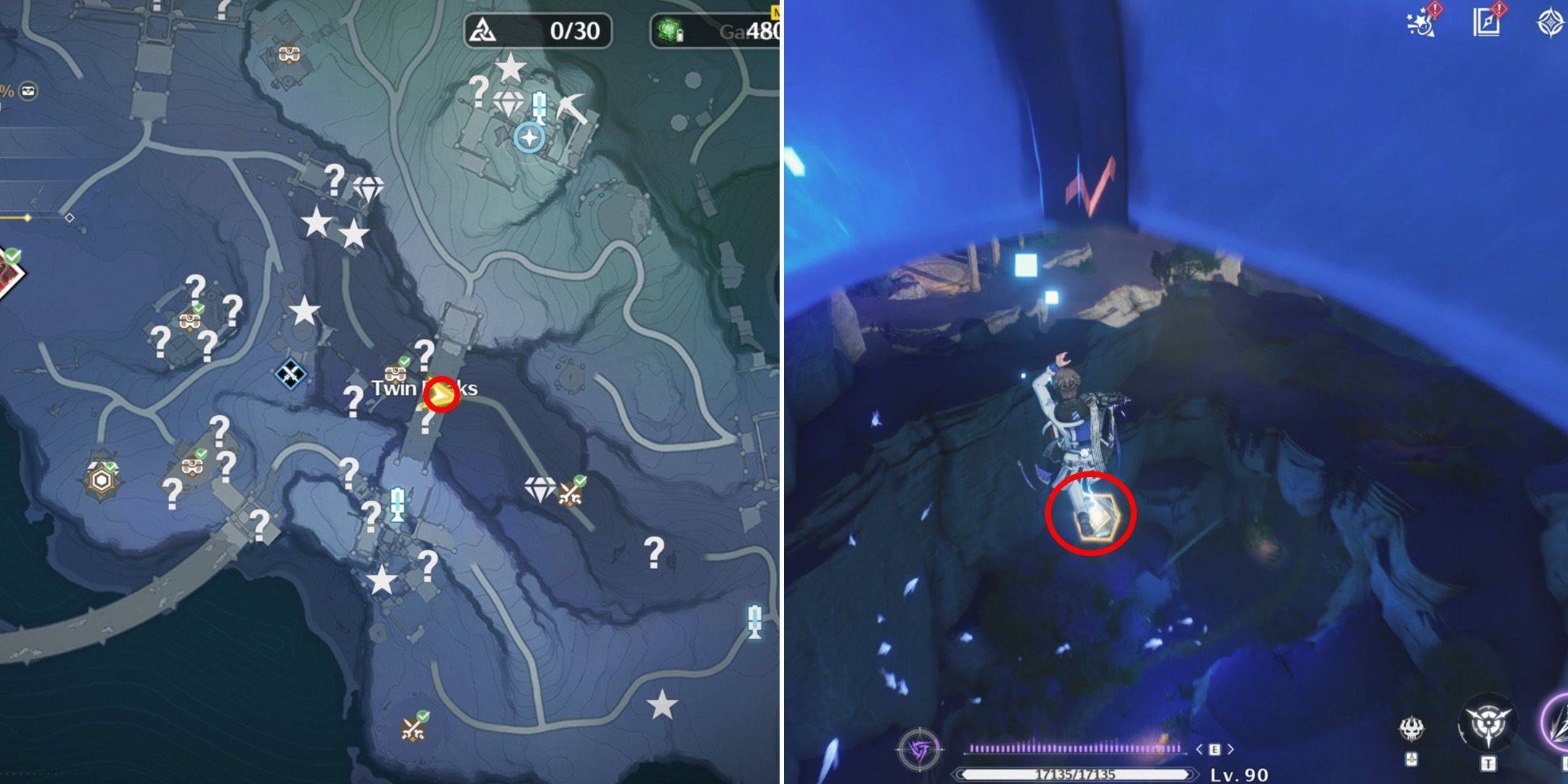 к юго -востоку от северной путевой точки Твин Пикс, недалеко от сломанного моста. Требуется прыжок и скольжение утеса.