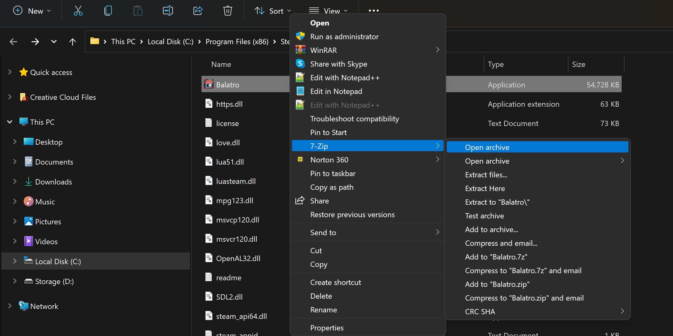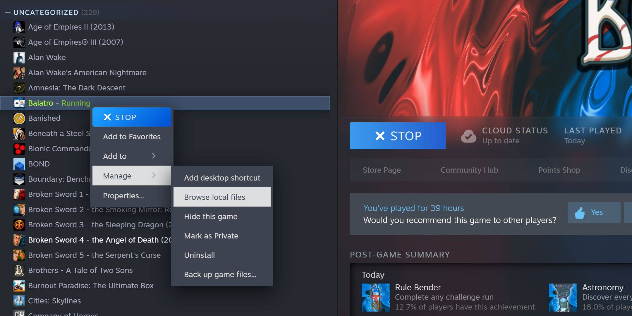 啟用Balatro的調試菜單需要7個拉鍊,這是一個免費的開源歸檔工具。找到您的balatro安裝目錄(通常c:\ program文件(x86)\ steam \ steamapps \ common \ balatro )。如果不確定,請在蒸汽庫中找到Balatro,右鍵單擊,選擇“管理”,然後“瀏覽本地文件”。