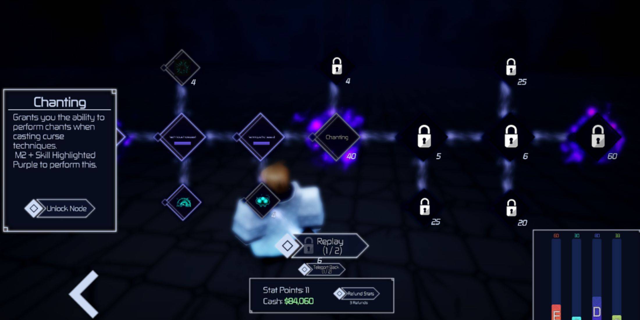 大多数能力是通过通过技能树进步而获得的,其成本各不相同。诵经,位于技术技能树中,需要大量40分。